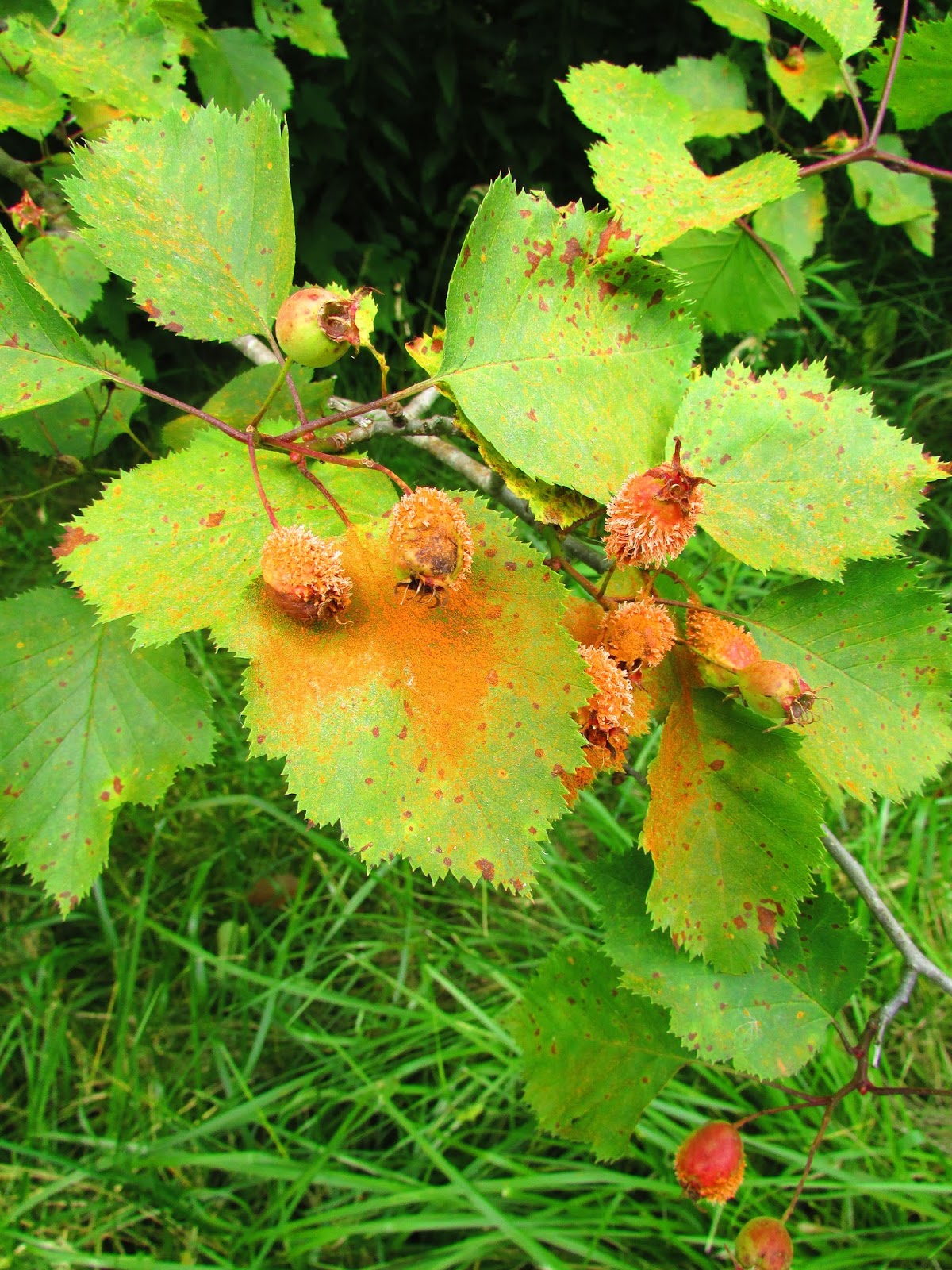 After eight years of biking, building and rebuilding there are very few surprises anymore. Today, however, I had two of them. It was a pretty standard morning starting out. Wade and I were doing our usual chalk drawings; I was photographing birds a half second to late, the usual. It was warm and muggy so we were kind of just taking it easy. We had already stopped and drawn a very elaborate landscape and a green elephant with pink polka dots when I had decided I should at least try to sneak in one build. We stopped at a site that I had not visited yet this year. There was a lot of material lying around since it was the site of past builds. I started scrounging around for material when I can across my first surprise. One of the rocks in the rubble had a secret compartment. On further inspection I found out that apparently somebody had decided to use my build site as a geocaching site. At first I thought about incorporating it into a build, but decided just to photograph it and put it back where I found it. At a later date it may have to become part of a build. The second surprise came on the way home. It was more of a poser than surprise. I came across a tree/bush that appeared to have like dried mulberries sort of on it. They were giving off a bright orange dust that looked like pollen. With the assistance of a friend and Google I was able to ascertain that it was a Hawthorne tree with a bad case of Cedar, Hawthorne Rust. It turns out it is a fungus that alternates between Cedars one year and Hawthorne the next to complete its life cycle. They seemed a lot cooler until I found out it was an ailment. It turns out that the fruit of a Hawthorne is not only good to eat but good for you, if of course they are not inflicted with rust. Apparently it doesn’t kill the Hawthorns but it does ruin the berries.